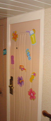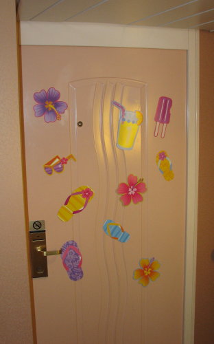 All the stateroom doors looked the same. Michelle, Ashlyn and Lily surprised us by decorating both doors to help us find the correct staterooms. It must have been a good idea. Ashlyn noticed on the second day that a decoration was missing - someone 'borrowed' one of the decorations for their door. When Michelle found it, she 'acquired' it but did not hang it back on their door.