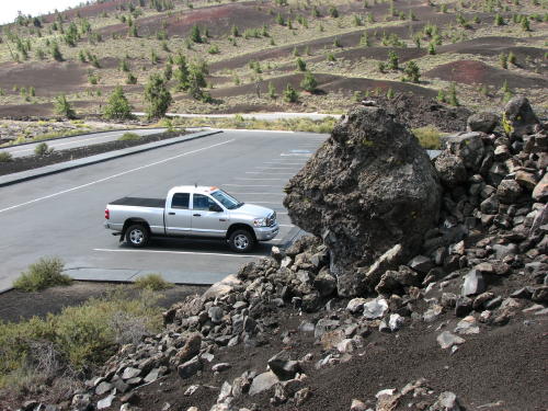 When Fred returned, Mary Lou was waiting. We hoped this lava rock did not roll on our truck.