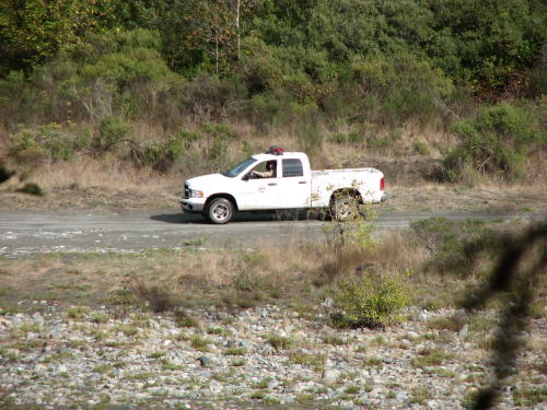 A short distance back up the road, the elevation let us see the river again, a hillside and a NPS vehicle heading for the location where we saw the other vehicle.