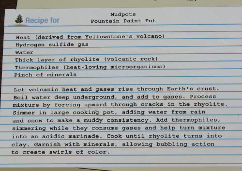 Mud pots are acidic hot springs with a limited water supply. Various gasses escape through the wet clay mud and cause it to bubble and 'stink' like rotten eggs.